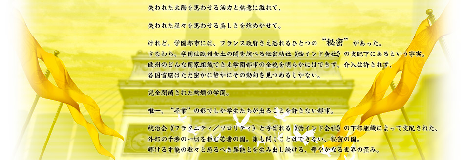 碩学輩出の結果として各国に強力なコネクションを有しており、各国政府は軽々しく学園都市に手が出せない状態となっている。更に、欧州を中心として世界の闇を暗躍する巨大組織《結社》が学園都市を運営しているというまことしやかな噂も流れている。そのことも、各国が、この謎多かれども有意義な学園都市を掌中にできない理由の大きなひとつとなっている。《結社》の影響力は強く、議会を掌握されている国もあるという。