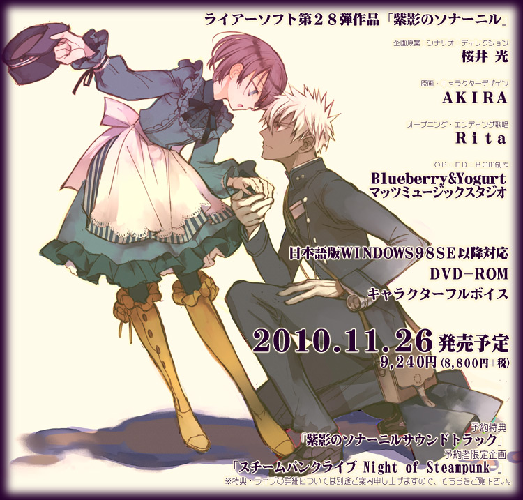 【1029】店舗特典テレホンカードのラフ画像を公開いたしました! こちらからご覧下さい。 【1023】スチームパンク5周年ライブ参加お申し込みの期間延長をご案内しております。こちらからご覧下さい。 【0921】徳島県で開催されるイベント「マチ★アソビ」にニトロプラス様ブースの展示企画に参加させていただくこととなりました。 弊社を含めたPCゲームメーカーの版権イラスト大判展示の他、各社のタペストリなどを販売予定。弊社は「紫影のソナーニル」タペストリを販売いたします。 ■ 詳細はニトロプラス様HP内の出展情報ページをご覧下さい。 【0918】チラシ・ポスターの配布を開始しました。お近くの店舗へ是非足をお運び下さいませ! 【0830】スチームパンク5周年ライブ参加お申し込みに関する詳しい情報を公開しました。こちらからご覧下さい。 【0830】「白光のヴァルーシア」でご好評いただきましたオフィシャルブログを、今回も展開予定です。9月からの開始を予定しておりますので、少々お待ち下さい。現在、仮ページを公開の上、バナーを展示しております。バナーキャンペーンは近日ご案内いたします。 |
