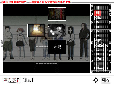 上記のように、ゲーム全体のストーリーをフローチャート化した画面を、プレイ中いつでも呼び出すことが出来ます。どこでストーリーが分かれているか、目的のエンディングに到達するために正しいルートを歩んでいるかが一目瞭然に確認できます。一度でも見たことあるイベントは画像が表示されますので、シーン回収にも便利です。
