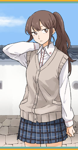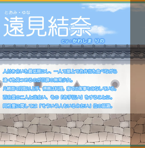 遠見結奈情報2 九ツ星女子の制服には複数のバリエーションがあり、学生は自分好みの組み合わせを選べる。 結奈の夏服はスタンダードな組み合わせ。