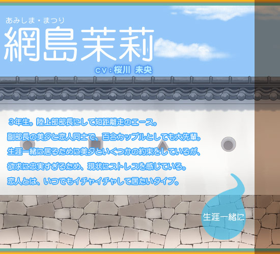 網島茉莉情報 網島は地域でトップクラスのランナー。 勝負勘の鋭さで大会での入賞も珍しくない。 走ること以外は、かなりだらしない。